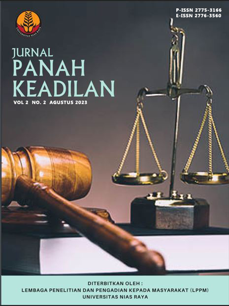 JURNAL PANAH KEADILAN adalah jurnal penelitian yang bersifat open access dan melalui proses peer review. Jurnal ini diterbitkan oleh Lembaga Penelitian dan Pengabdian pada Masyarakat Universitas Nias Raya. Dengan tujuan untuk menyampaikan penelitian asli dan isu-isu terkini yang relevan, jurnal ini secara berkala menerbitkan artikel dan laporan penelitian dua kali setahun pada Februari dan Agustus. Jurnal ini berfokus pada Hukum Pidana, Hukum Perdata, Hukum Tata Negara, Hukum Bisnis, Hukum Lainnya, Sosial dan Politik. Jurnal ini dengan baik menyambut kontribusi dari para peneliti atau penulis dengan disiplin ilmu terkait. Namun, keluwesan dan kebaruan penelitian menjadi prioritas dalam penerbitan. JURNAL PANAH KEADILAN memiliki ISSN 2775-3166 (Cetak) dan ISSN 2776-3560 (Online), serta terindeks dengan Google Scholar dan Garba Rujukan Digital (GARUDA).