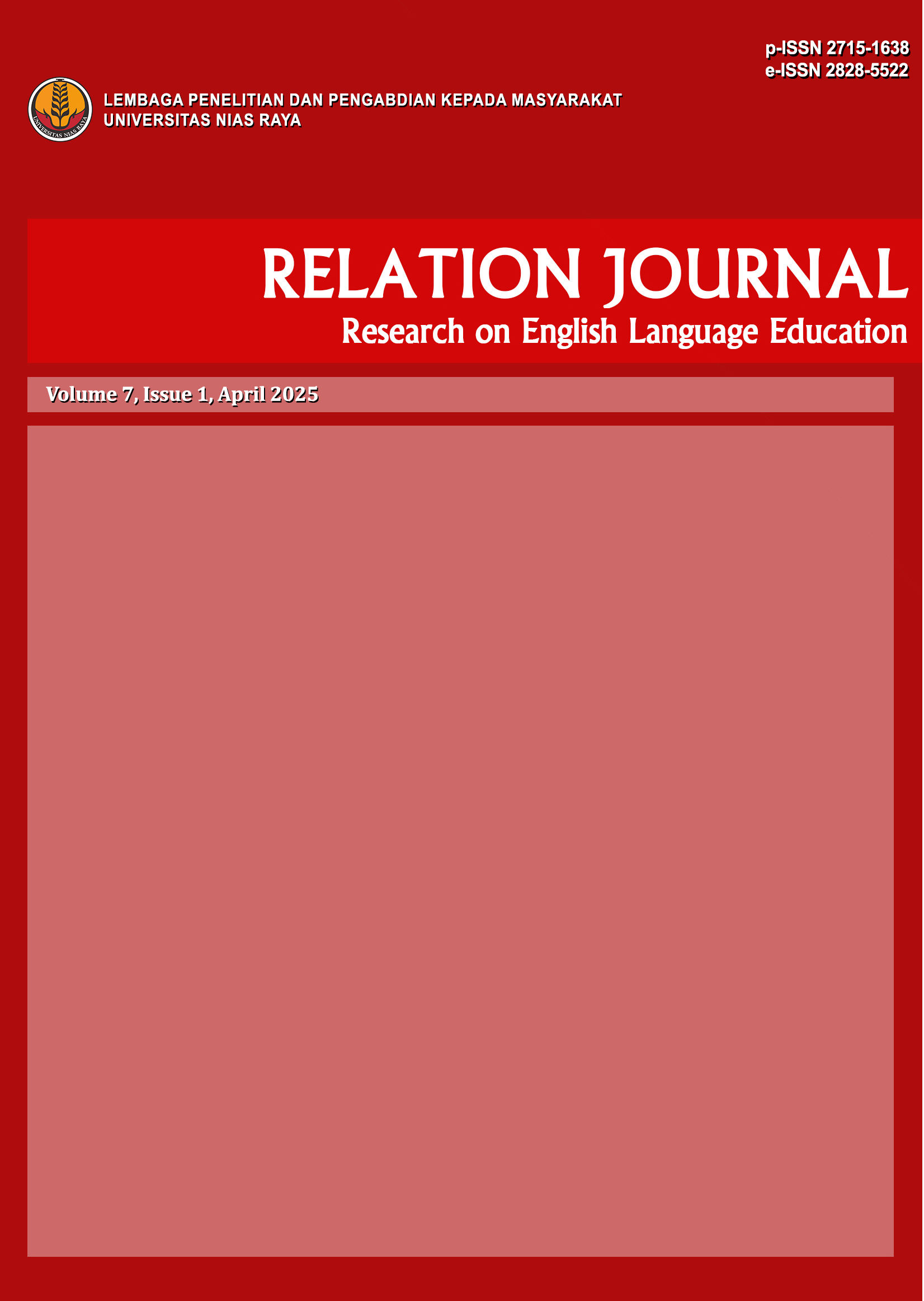 Research on English Language Education adalah akses terbuka, jurnal peer-review yang menerbitkan penelitian asli dan tinjauan sastra di bidang pendidikan dan ilmu bahasa Inggris yang diterbitkan oleh LPPM Universitas Nias Raya. Jurnal ini bertujuan untuk mengakomodasi artikel hasil penelitian di bidang pendidikan bahasa Inggris serta mempromosikan pengembangan pengetahuan dan pemecahan masalah di lapangan dan untuk membuat karya ilmiah di bidang penelitian yang relevan dapat diakses oleh publik. Jurnal ini diterbitkan 2 kali setahun pada bulan April dan September.